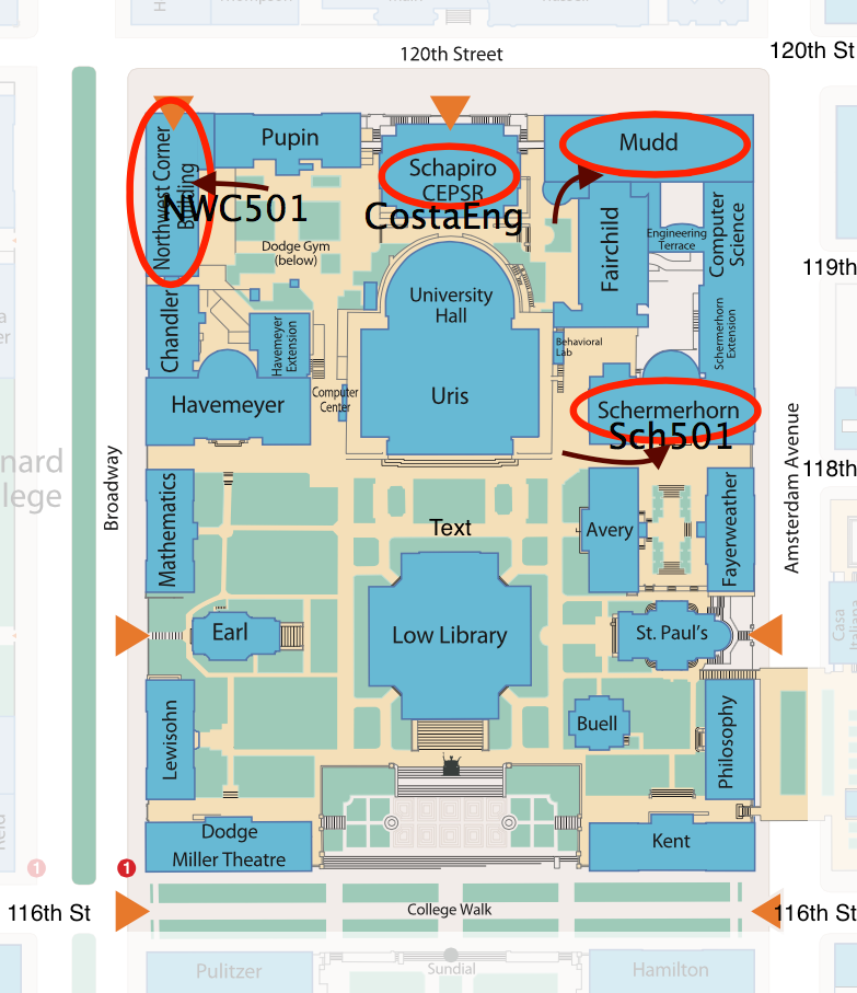 All events will be held on the Columbia University campus. The (main) entrance to Columbia University is at